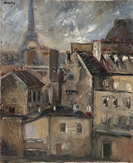 One of his earliest landscapes shows a corner of Paris on a gloomy day. The canvas, painted before the Second World War, is in a free Expressionist style. Two thirds of the painting are occupied by houses of different sizes and heights, crowding densely close to the street. In the background looms the bright silhouette of the Eiffel Tower. The canvas is covered in wide, thick brush strokes, the artist introduces graphic texture quite unexpectedly, making marks with the wrong end of the brush, in the impasto layer of paint that was laid on with a pallette knife. The well-orchestrated colours in the painting are so fine that it is almost monochromatic. It is dominated by silver and olive semi-tones evoking the subtle light of the Île-de-France. The details of the town are enveloped in a silvery mist.